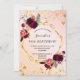 Na frente: Um convite para uma festa de aniversário de 50 anos, 50 (ou qualquer idade). Um rosa dourado, fundo branco cor-de-rosa cor-de-rosa com uma falso estrutura geométrica dourada. Decorados com flores roxas escuras e burgueiras, rosas e penas do estilo "boho". Estrelas douradas falsas pingando. Personalize e adicione um nome e detalhes da parte. O nome é escrito com um script de estilo manuscrito, letras pretas. Traseira: Rosa dourado, verde-claro-gradiente cor-de-rosa e estrelas ouro.