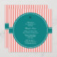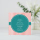 O design apresenta um padrão de listras cor-de-rosa e brancas alternadas no plano de fundo. Um padrão listrado elegante e no meio há um círculo teal onde adicionar o texto do seu convite.