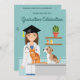 Comemore um estudante de veterinária na graduação com a ajuda dessa design personalizável que apresenta a ilustração fofa original de Destei de uma veterinária numa sala de exames de uma clínica veterinária. O veterinário está vestindo um boné de formatura preto com um punho amarelo, um casaco branco de laboratório, esfregões azuis e um estetoscópio em volta do pescoço. O veterinário tem cabelo castanho e expressão facial sorridente. Na parede, há duas prateleiras flutuantes castanhas com uma planta de folha verde e dois pequenos frascos de remédios colocados nelas. Na frente do veterinário, há um gato laranja e um filhote de cor castanha e branca sentado numa mesa de exame de cinza. Personalize as áreas de texto de exemplo com seu texto personalizado.