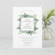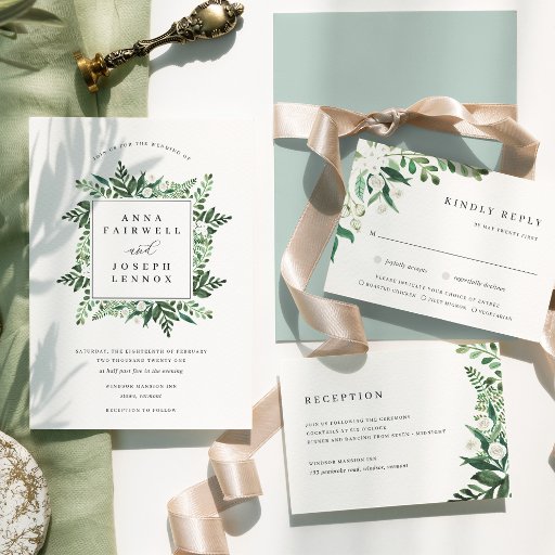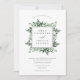 Nosso convite para casamento com a Greenhouse envolve seus nomes com uma elegante praça de folhagem verde, folhas botânicas e pequenas flores brancas. Personalize com seus detalhes de casamento em letras negras suaves clássicas com um sotaque de escrita de caligrafia. Um fundo branco nítido fornece um pano de fundo elegante e limpo para os detalhes da sua cerimônia. Uma bela escolha para casamentos noturnos de verão, núpcias de outono ou outono, ou casamentos no inverno de neve.