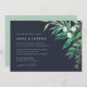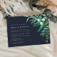 Nosso convite para casamento com a Greenhouse mostra seus detalhes de casamento acentuados por uma vibrante folhagem verde de aquarela, folhas botânicas e pequenas flores brancas. Um rico fundo azul-marinho adiciona drama e profundidade a este elegante convite para o casamento para casamentos no inverno na moda, núpcias de outono ou casamentos de verão.