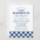 Um convite de chá de casamento moderno e rústico para um evento casual de CHURRASCO no quintal de verão. O texto inclui "Junte-se a nós para um Chá de casamento de Casais de churrasco "Eu faço"" honrando a futura noiva e noiva. Marinho azul e design branco.