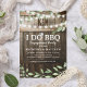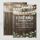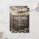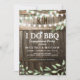Convites rústicos de festa de noivado de casal "Eu faço churrasco" com fundo de barril de madeira de celeiro, luzes cintilantes, folhagem botânica em aquarela, aliança de casamento, seu monograma e um modelo de celebração de chá de casal que é fácil de personalizar.