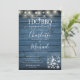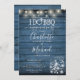 Luzes bonito de cordas e potes de pedras decoram seus detalhes especiais de celebração de festas de noivado, em tipografia elegante em um fundo azul de madeira rústica. Projetado por Thisnotme©