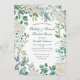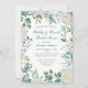 Um belo chá de panela com rosas brancas, folhas de eucalipto e verde.