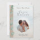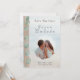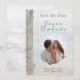 Anuncie o seu casamento com uma elegante simplicidade costeira. Este cartão de Save the Date apresenta uma suave costa em aquarela, um acento quente em madeira flutuante e uma ilustração vertical de eucalipto que traz serenidade natural ao seu design. A sua foto é enquadrada dentro de um círculo sutil pintado à mão, criando um ponto focal romântico que se sente arejado, moderno e atemporal.