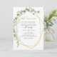 Convite de aniversário de casamento de 50 anos com eucalipto geométrico moderno e folhagem verde com moldura geométrica dourada e verso com lavagem de aquarela dourada.