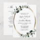 Convite de Casamento Tudo em Um Eucalyptus Dourado Metálico... Nosso convite de casamento botânico luxuoso "Tudo em Um" apresenta uma moldura oval metálica dourada adornada com folhas de eucalipto em tons de verde empoeirado e esmeralda, criando uma borda de aparência natural para o texto do convite dentro dela. O verso do cartão contém todos os detalhes que você normalmente veria em folhas separadas no pacote de casamento. Este convite de casamento de estilo moderno foi projetado para ser elegante e econômico... sem mencionar que economiza tempo. No verso, há também um modelo de código QR que você pode substituir pelo seu próprio código (ou excluir se não planeja usá-lo). Todo o texto de exemplo pode ser facilmente revisado com suas próprias informações no modelo de personalização.