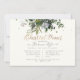 Flores aquarelas goma azul rústica e arranjo verde com lindos tons escuros de folhagem Eucalipto. Acentuado com o elegante e moderno falso roteiro escrito manual do Janto de ensaio Convites. Cor do plano de fundo DIY.