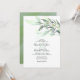 Um convite moderno em verde e branco com folhas de eucalipto em tons de menta e verde-oliva em fundo branco nítido com os nomes da noiva e do noivo em uma bela fonte escrita à mão. A placa se reverte para uma lavagem de aquarela verde esvaziada. Um convite perfeito para seu casamento de primavera ou verão. Adicione seus detalhes pessoais clicando no link personalizar. Isso faz parte de uma linda suite de casamento com envelope, menu, cartões de lugar e muitos outros elementos.