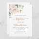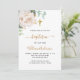 Um fundo branco decorado com um verde de eucalipto, um pedônio branco e folhas de ouro. Personalize e o nome e os detalhes da cerimônia. Letras pretas e ouros coloridas.