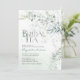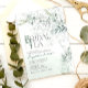 A design do convite apresenta ilustrações complexas de folhas de eucalipto e elementos botânicos, delicadamente entrelaçados para formar uma composição graciosa e orgânica. Itens correspondentes estão disponíveis.