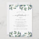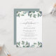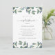 Estes convites para chás de casais de casamento simples e modernos apresentam folhas verdes de cor d'água eucalipto em um fundo branco limpo com moderno roteiro manuscrito.