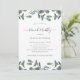 Estes convites para brunch e borbulhas, simples e modernos, apresentam folhas verdes de aquarela eucalipto em um fundo branco limpo com script manuscrito moderno.
