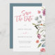 Flores coloridas misturadas com folhas de eucalipto criam uma bela borda floral para este convite de casamento "Salve a data". Este convite é versátil e pode ser usado para qualquer convite mudando a tipografia.