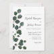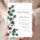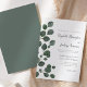 Este elegante convite de casamento botânico apresenta uma borda de cor aquática escura, eucalipto e folhas sobre fundo branco. O texto personalizável alinhado à direita combina o script de escrita manual de cinzas de carvão e fontes de bonés pequenos. O verde cinza sólido se coordena com o design de eucalipto.