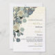 Um simples ramo de folhas de eucalipto com flores e sotaques dourados numa parede rústica de tijolos. Convite personalizado para casamento elegante e na moda. Altere facilmente as informações para o seu próprio design personalizado.
