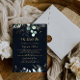 Este azul de ouro eucalipto que ainda fazemos como convite à renovação é perfeito para uma simples cerimônia de renovação e celebração de votos. Este design artístico apresenta folhagem verde de ouro, feita à mão, e cor d'água, eucalipto, em um fundo azul escuro, inspiradora beleza natural.