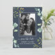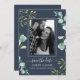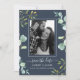 Um casamento de fotos simples e elegante salve o convite de data com design botânico verde eucalipto em um marinho azul chic que você pode personalizar com sua foto de noivado. Simplesmente adicione seus próximos detalhes de casamento. Se precisar de ajuda ou produtos correspondentes, entre em contato conosco através da nossa loja. Estamos felizes em ajudá-lo a fazer seu casamento o dia mais bonito!