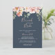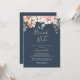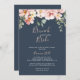 Este brunch de jardim de eucalipto com o convite para o chá da noiva é perfeito para um chá de casamento moderno. A design apresenta flores rosa, pinceladas, amarelas, com folhas de eucalipto em fundo azul-marinho escuro.