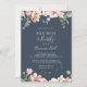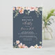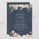 Este chá de panela de eucalipto e jardim de eucalipto é perfeito para um chá de casamento moderno. A design apresenta flores rosa, pinceladas, amarelas, com folhas de eucalipto em fundo azul-marinho escuro.
