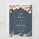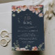 Este convite para festa de noivado de CHURRASCO "Eu faço" floral do eucalipto é perfeito para uma festa de noivado moderna, janto de ensaio, chá de casais, após festa ou qualquer evento de casamento. A design apresenta flores rosa, pinceladas, amarelas, com folhas de eucalipto em fundo azul-marinho escuro.