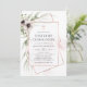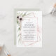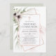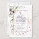 Primeiro convite de comunhão sagrado com flores anêmonas e folhas de eucalipto em moldes geométricos de ouro rosa.