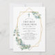Floresta de eucalipto verde primeiro convite de comunhão sagrado com quadro geométrico dourado personalizável para suas especificidades de evento.