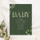 Tema de chá com a inscrição "BABY" em bege cercado por eucalipto verde. O fundo é verde-escuro na frente. O lado inverso é bege.