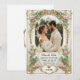 Apresente seus amigos e família aos primeiros vislumbres de seu dia especial com este convite de cartão salva-vidas elegante e exclusivo. Este design foi criado especificamente para mostrar uma foto valiosa de você e seu parceiro de vida enquanto apresentava detalhes dourados junto com florais cor-de-rosa e eucalipto verde. É perfeito para qualquer tema de casamento romântico, jardim, vintage e eterno, pois oferece uma estética vintage, mas moderna, que irá lindamente complementar seu momento especial.