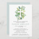 Este simples convite ao batismo moderno apresenta uma cruz de aquarela de eucalipto verde. Tipografia simples em cinzas escuras verde para personalizar com seus detalhes principais, incluindo nome do bebê, data, hora e local do batismo e recepção e informações de RSVP O lado inverso é coordenado em uma cor verde-clara