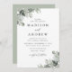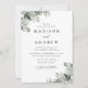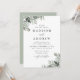 Convites de casamento Elegantes de eucalipto com seus detalhes no centro da design com buquês de eucalipto nas esquinas em tons de verde claro e sábio escuro. Os convites de casamento de eucalipto com aquarela invertem para exibir um plano de fundo verde de sábio sólido.