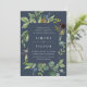 Elegante cartazes de convite para casamento botânico, seus detalhes de celebração de casamento com uma borda de folhas de cor aquosa de eucalipto, flores azuis e folhagem verde em um fundo azul de marinho enfumaçado.