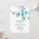 Este convite de casamento simples e elegante apresenta uma coloração aquosa suave de galhos de eucalipto azuis e verdes. Está prevista uma redação para a celebração de uma missa nupcial católica. O convite multifunções tem informações de recepção, rsvp e registro de presentes no verso.