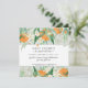 Trabalho de arte de aquarela de laranjas doces, flores, frutas para bebês, citrinos e folhas de eucalipto com fundo verde de menta macia para "Eucalyptus Orange Mint a Little Cutie Chá de fraldas Invitation. O verso tem texto tipográfico, "um pouco de beleza está a caminho", e outra cor de laranja, folhagem das folhas e o nome do seu futuro bebê, se o escolheu ou simplesmente apague o texto, se não o escolheu. Trabalho de arte por uma artista e designer internacionalmente licenciada, Audrey Jeanne Roberts, copyright.