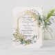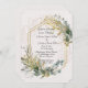 Um belo convite para o casamento feito em um fundo branco com as Folhas Eucalyptus colocadas em um quadro geométrico dourado. Este convite faz parte de um conjunto de produtos que correspondem ao design. Este convite é perfeito para um casamento mais elegante numa igreja.