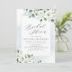 Moderna cor branca-d-água-viva floral eucalipto verde-verde-verde-verde-moderno e um roteiro de "chá de panela" em fundo azul-poeirento, com monograma de casal nas costas, elegante e na moda, convites de chá de panela excelentes para casamento rústico, casamento botânico e casamento de praia. Ver todas as peças correspondentes na coleção
