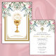 Celebrar o Sacramento da Primeira Comunhão é uma ocasião maravilhosa. Este tradicional vintage, feito por hábitos católicos, floral da Primeira Comunhão, Convite com um Chalice de ouro, Santo Eucarista e design floral cor-de-rosa é certamente a expressão da beleza e solenidade deste dia especial. Todo texto e fontes podem ser modificados facilmente.