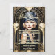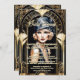Um quadro de estilo deco de arte dourada falso de ornamentado com delicado detalhe fino, tem um arco brilhante que enquadra uma bela moça loira caucasiana. Ela está vestida para os nove vestindo uma cinza do vestido do ombro e um chapéu de cinza prateada correspondente. Seu cabelo louro é cortado em um bolso de na moda e ela está vestindo batom vermelho escuro. Se você está hospedando uma década de 1920; vinte e poucos anos; festa de aniversário temática; chá de panela ou evento; esta na moda e design legal é perfeita para sua ocasião especial. Eles são perfeitos para uso profissional e pessoal, pois os modelos na frente e no verso podem ser personalizados para se adequarem à sua celebração.