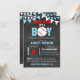 O tema único do beisebol, os cartões de convites para vitrines. Um plano de fundo com basebol em HOME RUN! - É um garoto. Cor azul e branca. Placas de modelo editáveis para que você possa adicionar suas informações. Obtenha autocolantes para os seus favores.