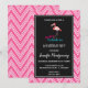Um convite de festa de aniversário com uma ilustração gráfica de um flamingo rosa. O texto diz: Fabuloso Enxame. Listras rosa de chevron desenhadas à mão ao fundo.