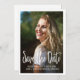 Foto de gradação Salve o cartão de data/anúncio formatado verticalmente com texto de script de caligrafia. A parte traseira da placa é branca, mas a cor é personalizável com a ferramenta design do Zazzle. Entre em contato conosco para obter ajuda com a personalização ou para solicitar produtos correspondentes.