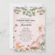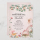 Este convite personalizado apresenta um tema de festa do Jardim Encantado. O fundo é um rosa macio desbotado, com imagens mágicas de cogumelos, flores, e uma pequena fada fofa. Lanternas e luzes de fada acendem ramificações através da parte superior.
