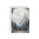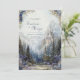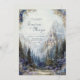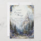 Invite your guests into a world of majestic romance and fairytale elegance with this exquisite wedding invitation. The design transports you to a magnificent, ethereal alpine landscape, where a grand, Gothic stone castle with blue spires sits dramatically nestled on a rugged mountain peak. The scene is framed by towering pine forests and misty, snow-capped mountains, creating a profound sense of scale and wonder. The foreground is lavishly filled with abundant purple, lavender, and white wildflowers, with a winding dirt path leading into the scene. The overall aesthetic, rich in detail and soft, diffused light, perfectly sets the stage for a grand, destination, or fantasy-themed wedding. This invitation card is ideally suited for a grand, formal wedding, a fantasy-themed celebration or reception, or a romantic engagement party in the winter or spring. It would also perfectly suit a destination wedding in the mountains or a lavish vow renewal ceremony. The card's captivating blend of castle architecture and ethereal florals ensures it is versatile for any solemn ceremony, corporate gala, or refined birthday announcement.