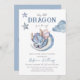 Celebre o bebê que vai ser nascer com este convite de conto de fadas encantado, temido pelo livro de histórias, em cores azuis, com livros, dragões e nuvens para o seu Chá de fraldas Little Dragon Boy