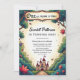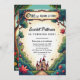 This elegant fairytale-style birthday invitation is perfect for a modern birthday. The retro design features a vintage enchanted forest, a castle illustration, and black calligraphy on a storybook-themed background.