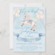 Convite de Chá de fraldas com tema Horso que apresenta ilustração de um adorável pônei magico branco e estrelas de ouro de conto de fadas Watercolor com balões de cores pastéis e fita azul para celebração!