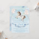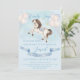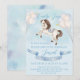 Convite de aniversário com tema Horse, com ilustração de um lindo cavalo bebê e estrelas de ouro de conto de fadas Watercolor com balões de cores pastel e fita azul para celebração!