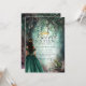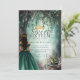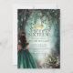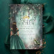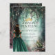 Uma ilustração com uma aquarela esbranquiçada da folhagem esmagadora em verde esmeralda e mauve e roxo, brilhante com luzes de fadas e poeira mágica, decora este primavera de verão no outono inverno Sweet 16 convite com um tema de floresta encantado. Ele também apresenta uma ilustração de uma princesa em um vestido verde esmeralda escuro, vestindo uma coroa de ouro, assim como um príncipe sapo de touro com uma coroa de ouro. Um convite elegante e moderno para um conto de fadas do décimo sexto aniversário. Perfeito para raparigas e famílias que adoram o cenário florestal de conto de fadas, o tema da floresta de fadas ou do jardim de fadas e o verde esmeralda, o mauve e o ouro.