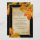 A versão em fundo preto é especialmente elegante e bonito. Esta brilhante design de casamento em folha de outono foi criada da trabalho de arte que foi pintada manualmente por Audrey Jeanne Roberts e então desenhada graficamente para este simples, moderno e limpo conjunto de convites para casamento com produtos compatíveis para chás, recepções e eventos formais. Folhas de outono que transformam as cores do vermelho brilhante em laranja, dourado e abacado em pedaços verdes das árvores e são colocadas sobre uma simples borda de folha de ouro em estilo de deco, papel de pergaminho em estilo de vintage angustiado vestido, manchado de chá e confete como brilho dourado sujo, esplendores para um toque final. Do lado oposto estão as folhas e bolinhas cintilantes e brilhantes.